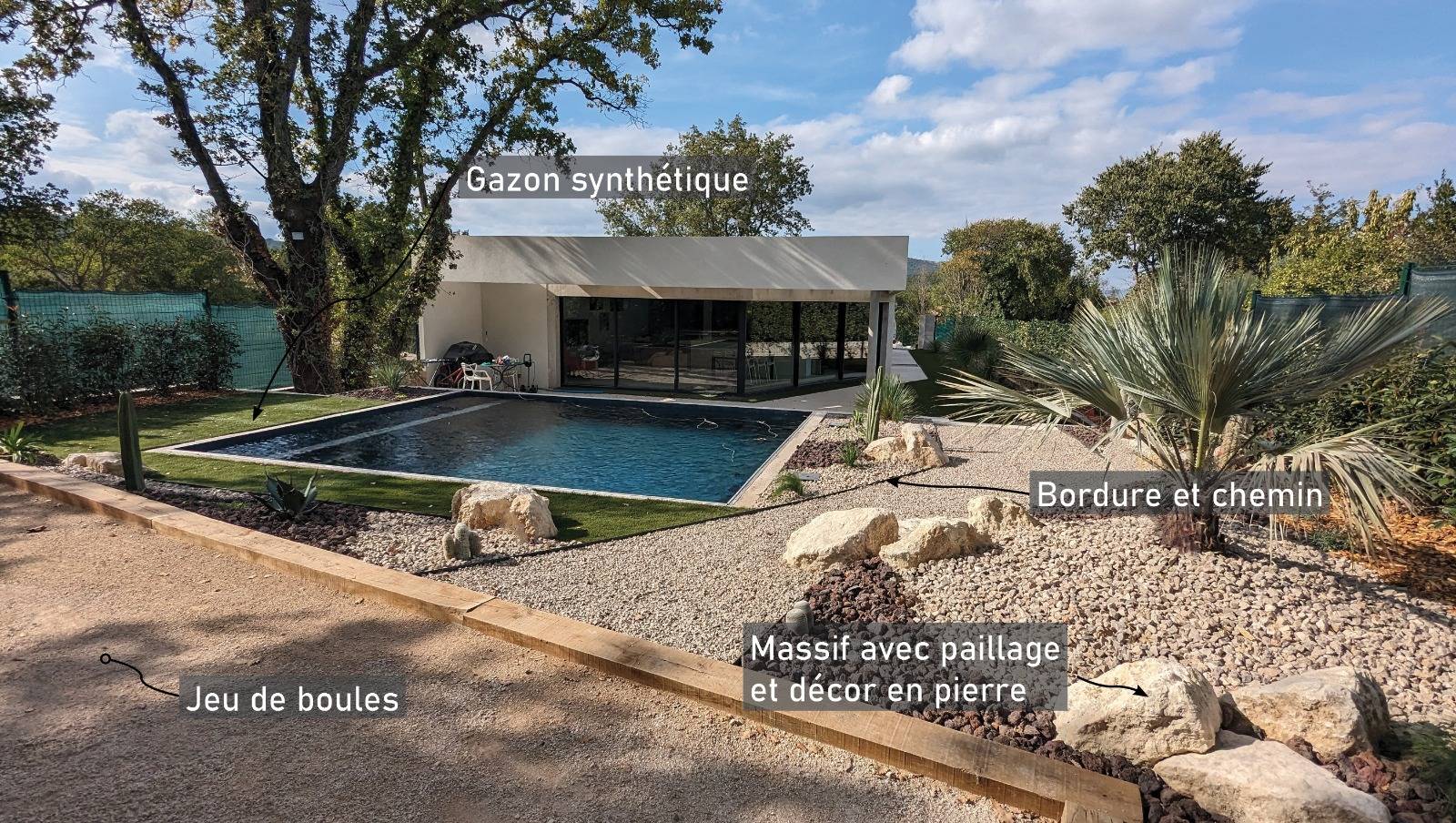 Sur ce terrain, situé au Puy Ste Réparade, dans les Bouches-du-Rhône. Nous avons aménagé un jardin économe en eau, autour de cette villa moderne. Après avoir réalisé, des murs de soutènement et re terrassé les abords de la piscine. Nous avons implanté sur terrain un jeu de boules, entouré de massif méditerranéen, avec des palmiers tels que Brahea Armata, l'importance dans ce projet était d'optimiser l'espace qui est sur un jardin restreint, et le second point était de s'isoler de la proximité du voisinage pour cela après avoir implanté des clôtures rigides et des occultants, nous avons planté des Photinias pour les haies sur le fond et des Jasmins étoilés, là où les zones étaient plus étroites.