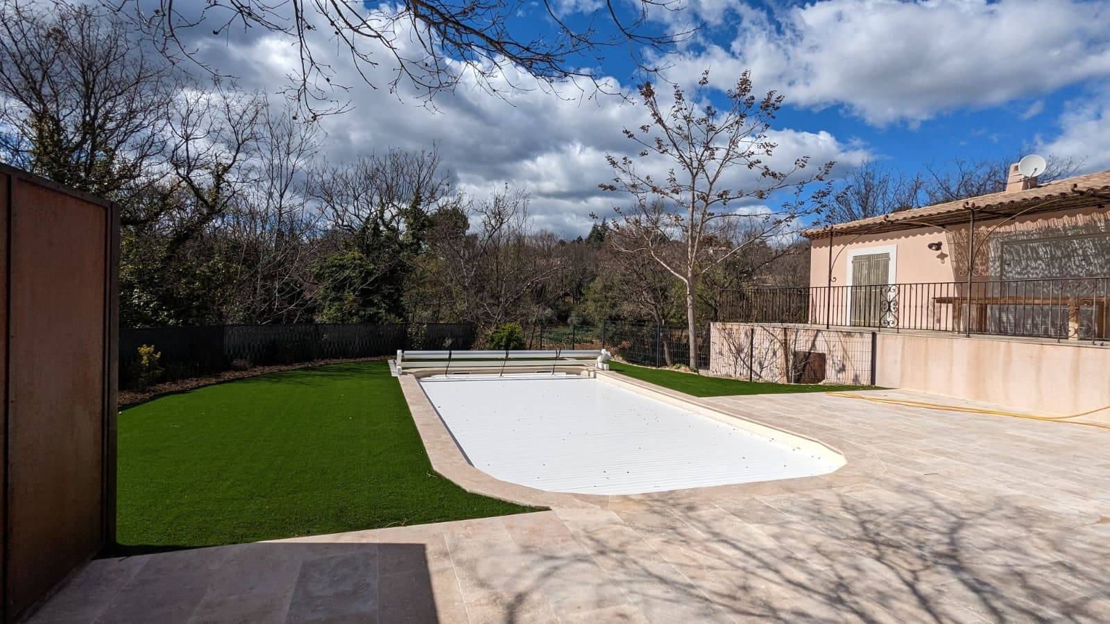 À La Verdière, dans le Var, un projet d'aménagement a été mené autour de la piscine, mettant l'accent sur la réfection de la terrasse. L'ancienne terrasse en bois a été remplacée par une nouvelle terrasse en travertin, une pierre naturelle qui apporte élégance et durabilité.