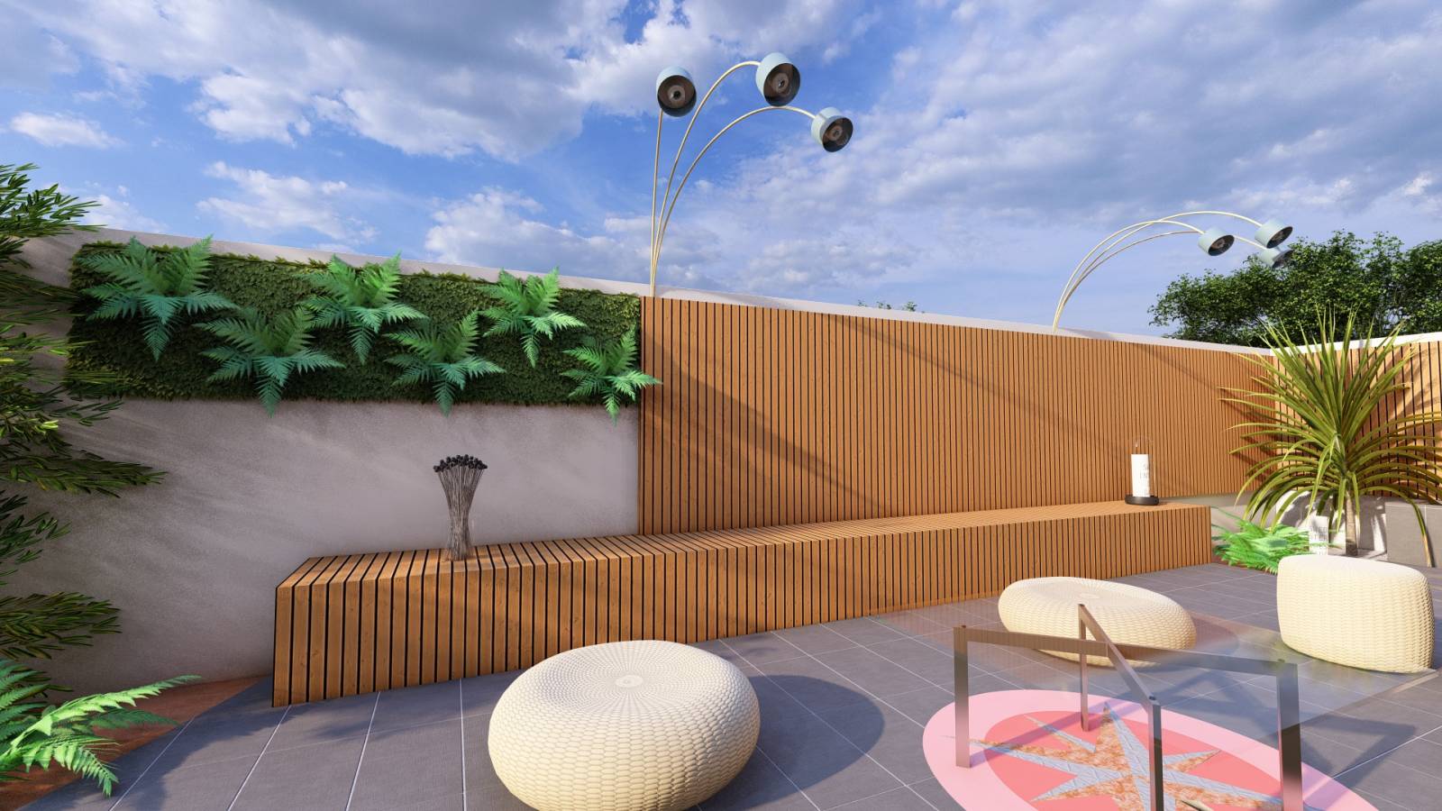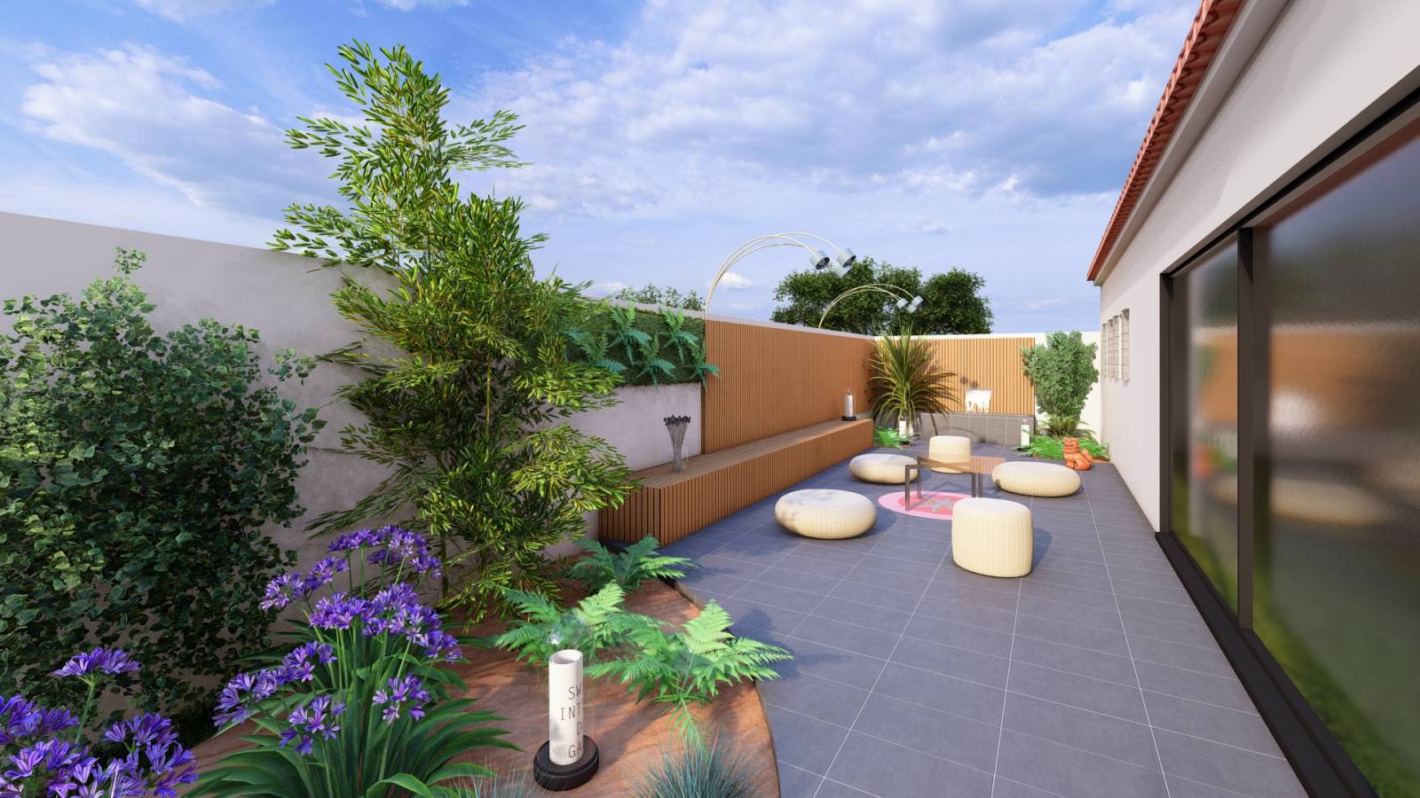 Quant à la partie sud du jardin, plus étroite, elle offre une terrasse en pierre naturelle agrémentée d'une banquette, idéale pour accueillir confortablement famille et amis. Les murs oppressants sont astucieusement dissimulés par un bardage en bois et un mur végétal, apportant une touche moderne à l'ensemble. Au fond, une fontaine dotée d'une lame d'eau contribue à atténuer les nuisances sonores environnantes.