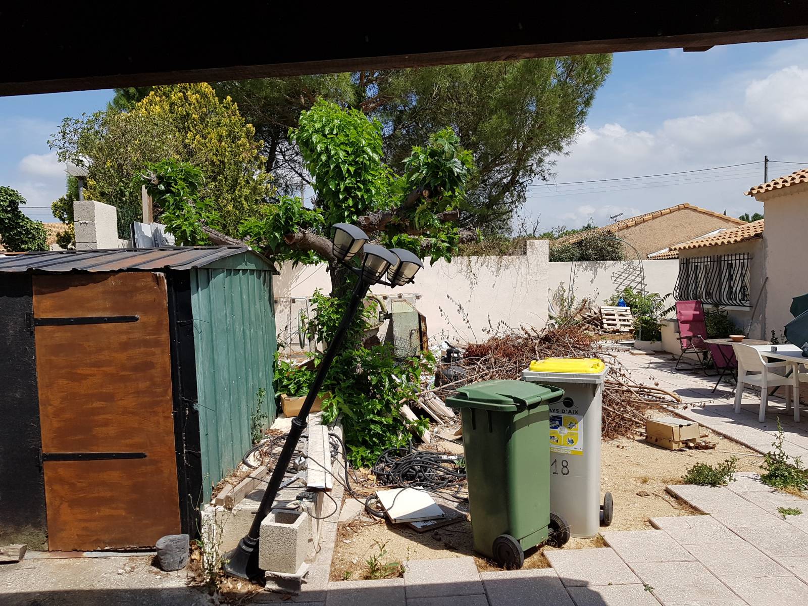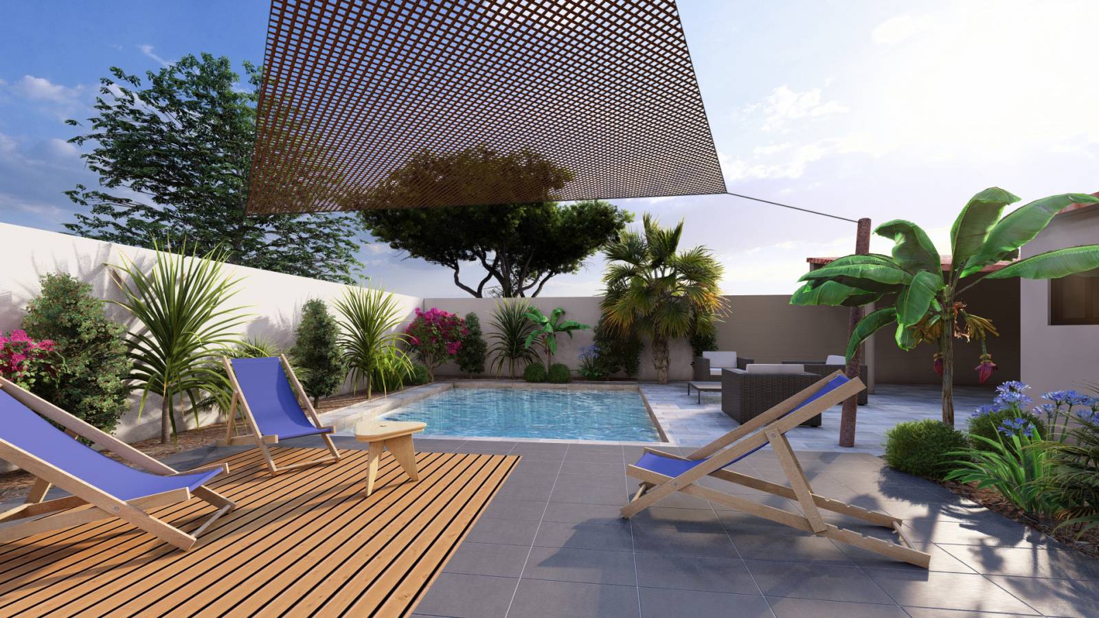Le jardin se divise en deux parties distinctes. La première, ouverte, accueille un espace dédié à la piscine, un pool house et des terrasses en pierre. Une toile d'ombrage apporte une touche de fraîcheur durant les chauds mois estivaux. Un carré en deck complète cet espace, orné d'une végétation exotique et fleurie, comprenant agapanthes, palmiers et bananiers qui viennent agrémenter et habiller les murs périphériques.