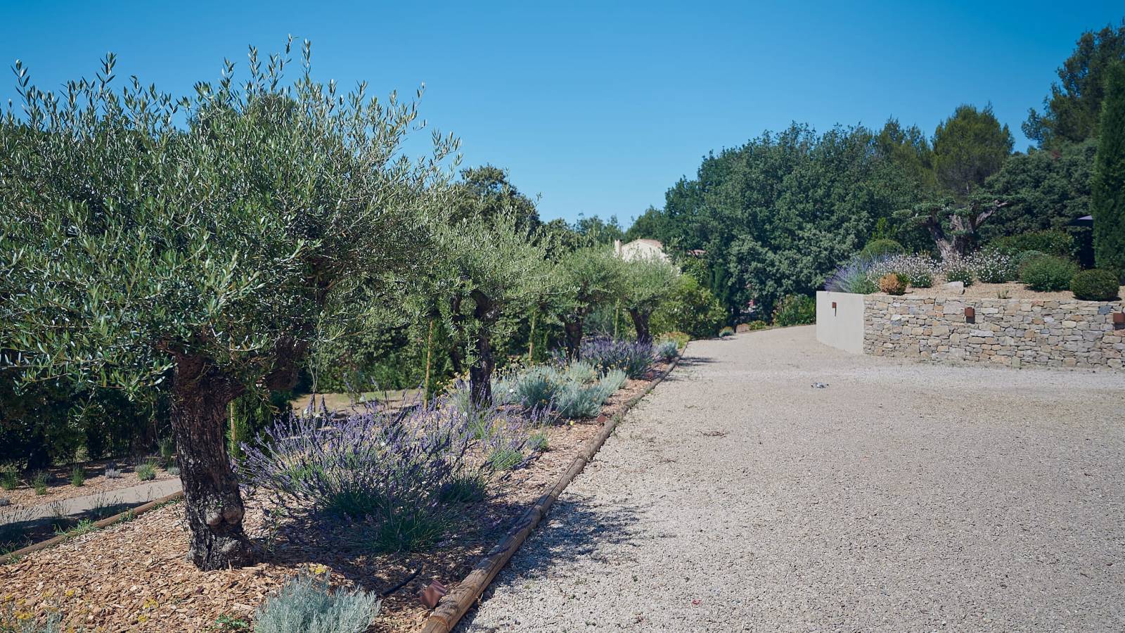 oliviers taillés en nuage donnent une note contemporaine à ce