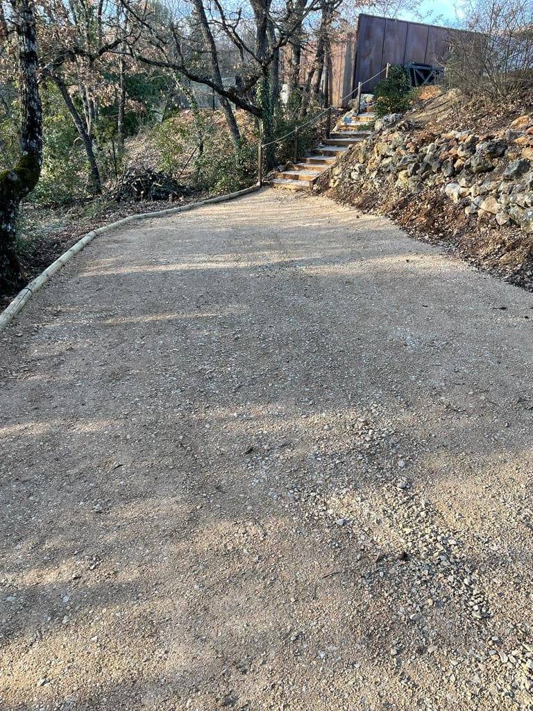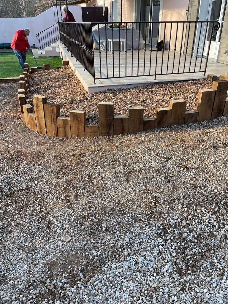Des escaliers en traverse de chêne permettent de rejoindre les différentes restanques, les marches sont habillés avec du gravier concassés des soutènements sont réalisés de deux manières différentes, l'une avec des traverses posés à l'horizontale et l'autre avec des traverses posés sur un lit de gravier et solidarisées avec une semelle de béton, ils sont positionnés à la verticale et permettent de donner une forme arrondis aux massifs.