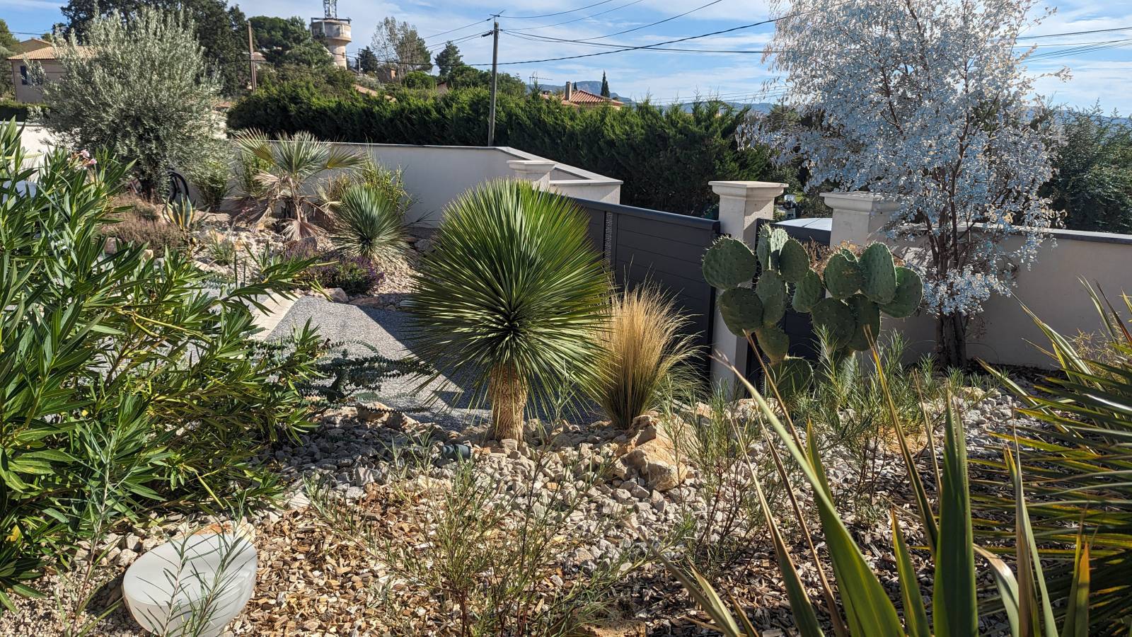 Les contours sont habillés, avec des massifs méditerranéens, qui comprennent des Palmiers, plantation d'un Olivier, des graminées et des Agaves Cactus.
