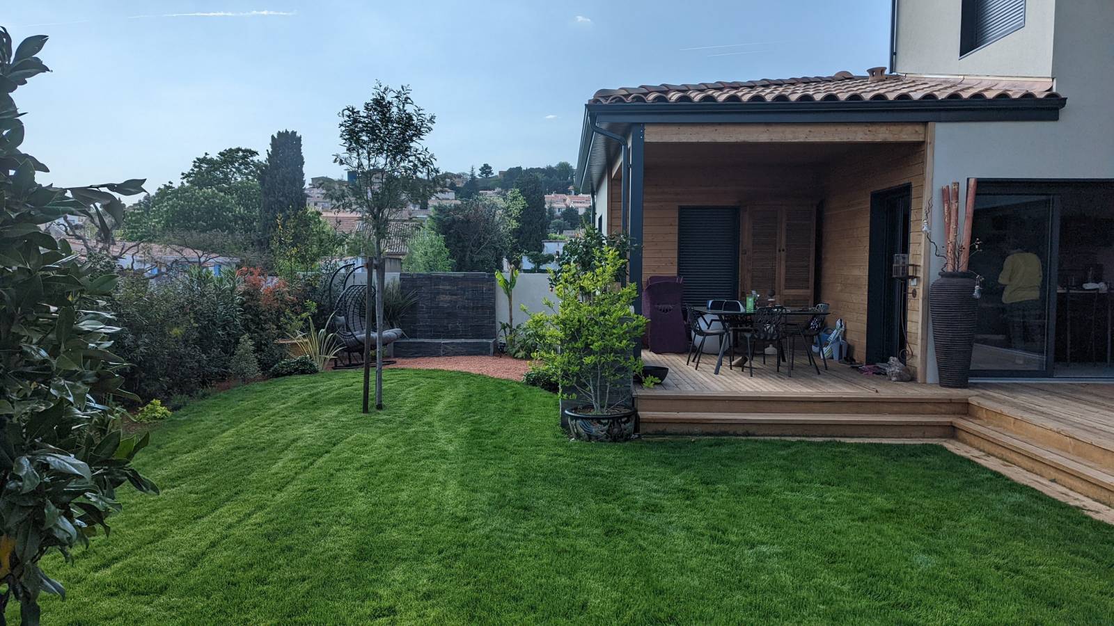 Sur la partie arrière, les contours d'une fontaine sont habillés avec un bananier, des phormiums et des boules de piteuse porane, il y a également la création d'une terrasse en bois faite en pin.