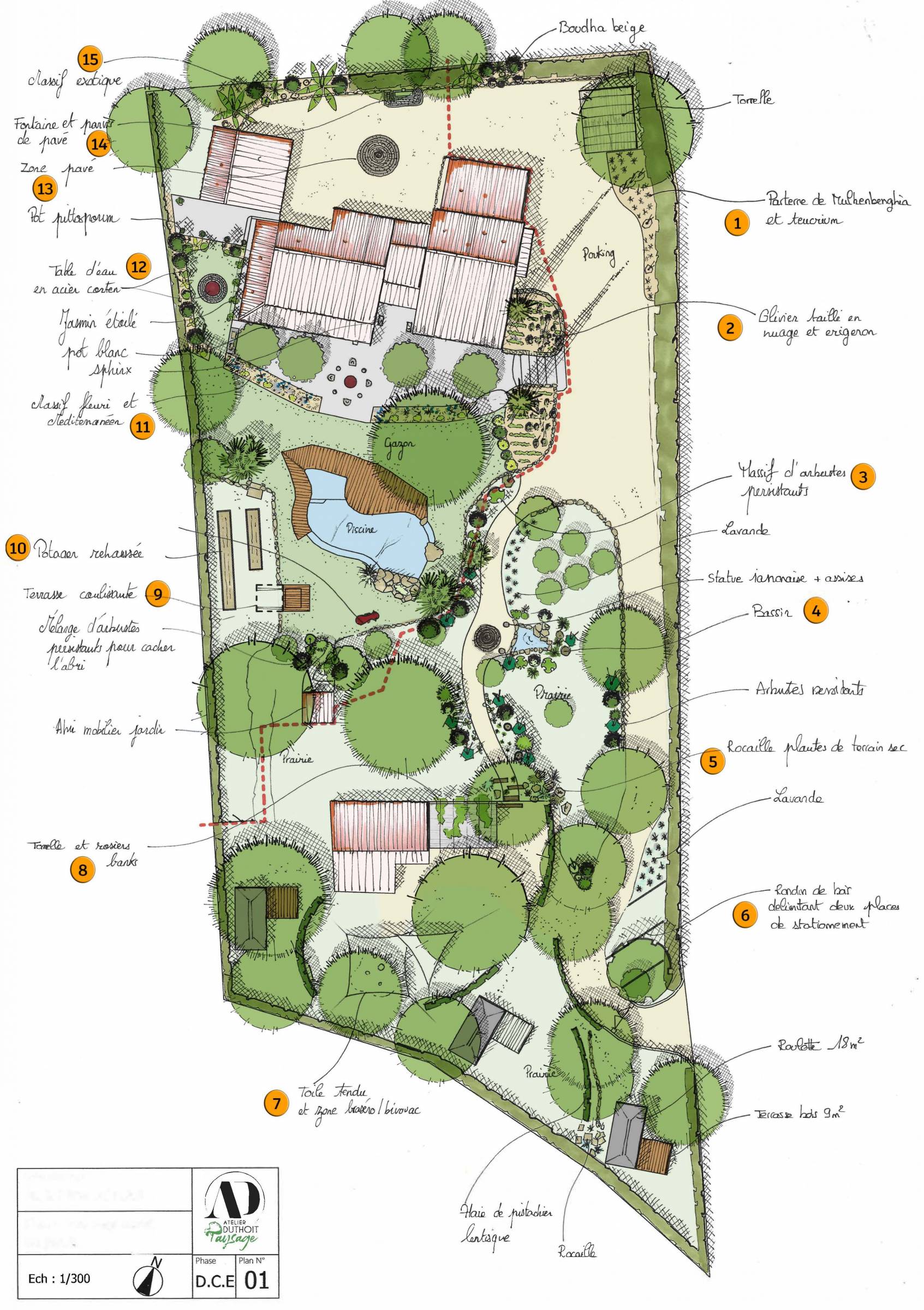 Sur ce plan, nous retrouvons les explications qui permettent de comprendre le projet en suivant une numérotation, qui correspond à une palette végétales ou de matériaux, qui permet à la clientèle de se projeter.