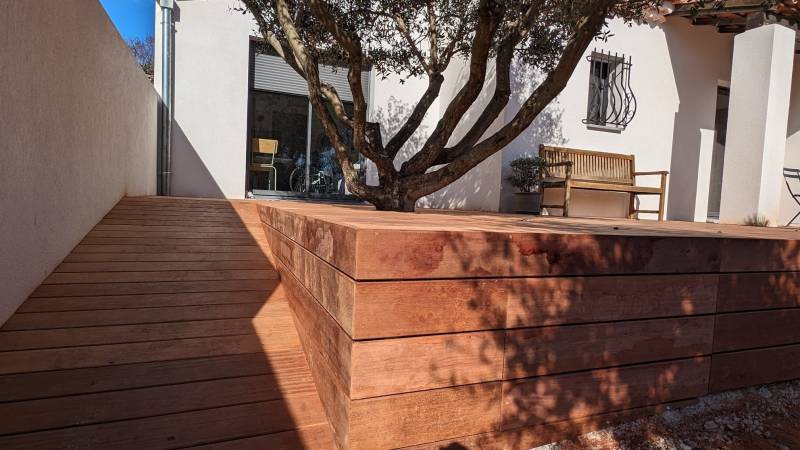 Sur ce chantier situé à Eguilles dans les Bouches-du-Rhône près d'Aix-en-Provence, nous avons réalisé une terrasse en bois. Le bois utilisé est du merbau. Il a été sélectionné pour ses capacités physiques et de haute résistance.
