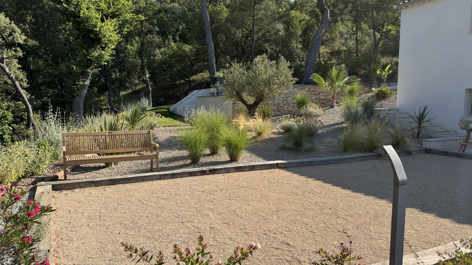 L’aménagement minéral, composé de graviers clairs et de murets en pierre, souligne la beauté des végétaux tout en renforçant le caractère provençal du lieu. Il assure également praticité et durabilité, grâce à un entretien limité et une intégration harmonieuse au paysage environnant.