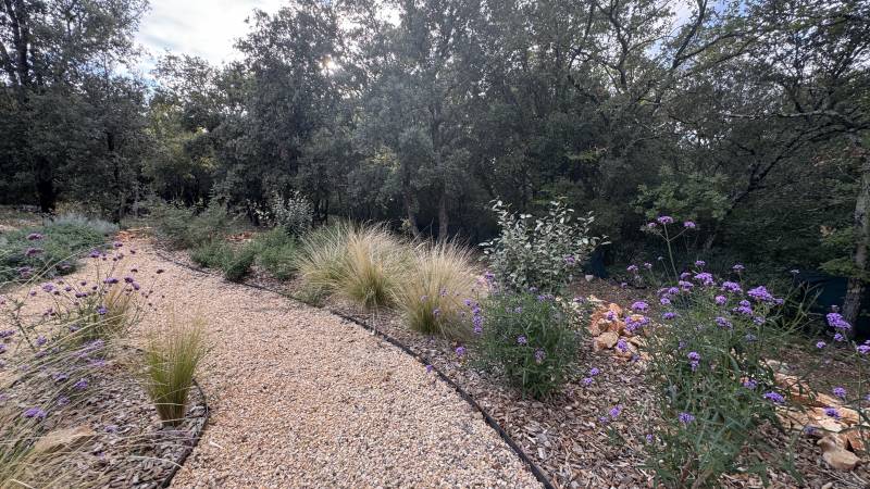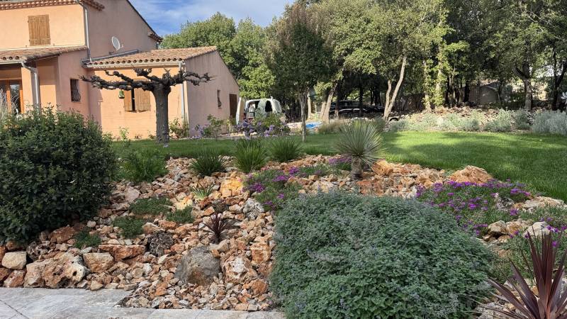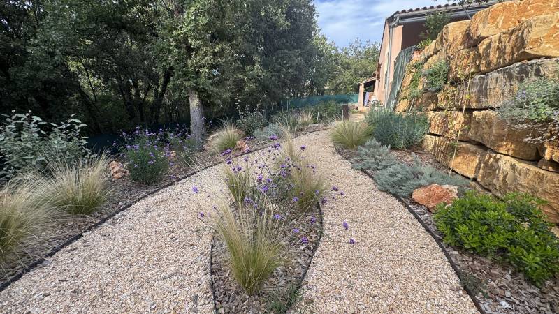 Un an après sa réalisation, ce jardin méditerranéen situé à Saint-Maximin-la-Sainte-Baume, à proximité de Rians, révèle toute la richesse de son évolution. Pensé pour s’intégrer naturellement dans son environnement et résister au climat du Sud, il offre aujourd’hui une ambiance harmonieuse et vivante.